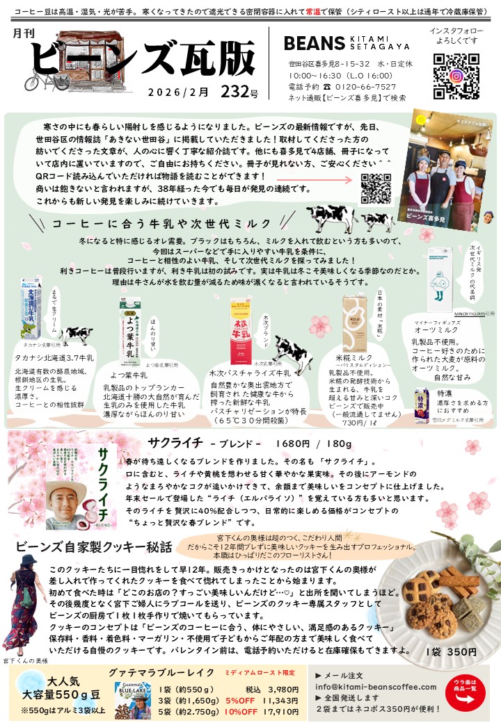 2026.01.31 ビーンズのきままなブログ, 瓦版 コメント: 0 【瓦版VOL.232】コーヒーに合うミルクの話やクッキー秘話 宮下コーヒー豆屋が毎月つくる、ちょっと読みたくなる新聞—— その名も『ビーンズ瓦版』。今月も楽しくやっていきます! 清水姉バレンタインにコーヒーやクッキーどうぞ☕️ Post Share Hatena Pocket RSS feedly Pin it 【瓦版VOL.231】2026年よろしくお願いします!ビーンズの昔話など。 関連記事 【瓦版VOL.203 2023年9月】ビーンズ35歳になりました。これからもよろしくお願い... 【瓦版VOL.202 2023年8月】宮下、焙煎と漁師見習いと私。愛するあなたのため~毎... 【瓦版VOL.200 2023年6月】長くビーンズを続けていくために。これからも宜しくお... 【瓦版VOL.185 2022年3月号】清水姉、冬のシモヤケと格闘。ボリビア・ナイラカタ... 【瓦版VOL.206 2023年12月】2023年感謝の気持ちを込めて年末セールやります! 【クリスマスブレンド2種類販売開始~】 コメント コメント ( 0 ) トラックバックは利用できません。 この記事へのコメントはありません。 返信をキャンセルする。 名前 ( 必須 ) E-MAIL ( 必須 ) ※ 公開されません URL Δ