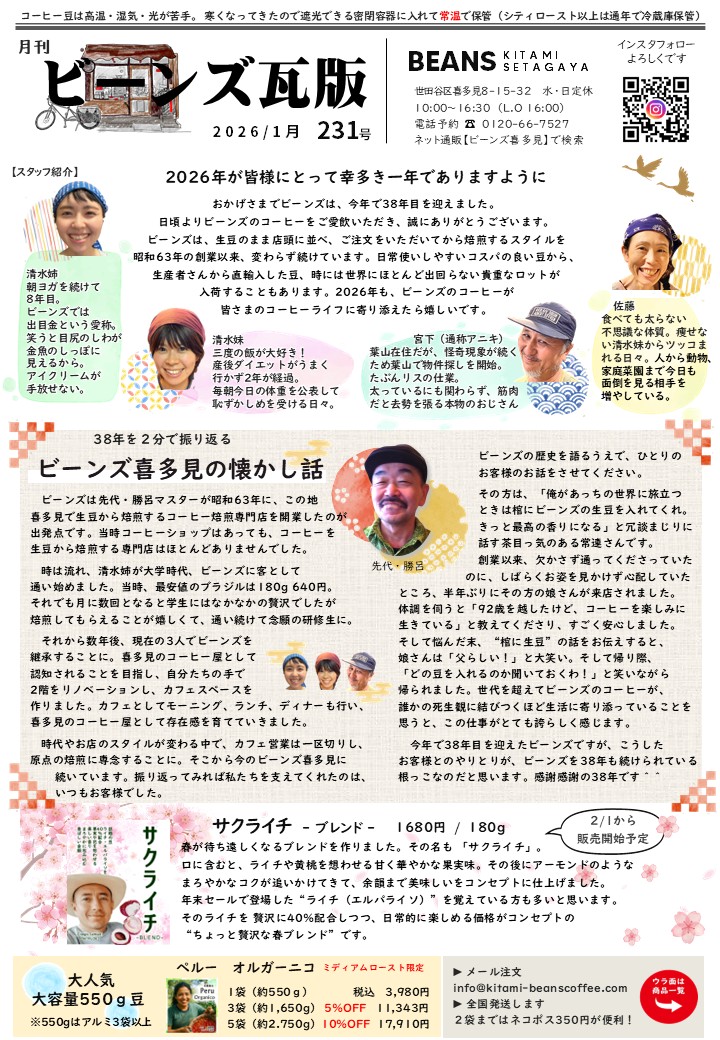 2026.01.12 ビーンズのきままなブログ, 瓦版 コメント: 0 【瓦版VOL.231】2026年よろしくお願いします!ビーンズの昔話など。 清水妹コーヒー豆屋が毎月つくる、ちょっと読みたくなる新聞—— その名も『ビーンズ瓦版』。2026年もビーンズらしく楽しくやっていきます! 宮下2026年も幸多き年になりますように~☕️ Post Share Hatena Pocket RSS feedly Pin it 【瓦版VOL.230】2025年お世話になりました!感謝の年末セールやります! 関連記事 【瓦版VOL.164 2020年6月号】焙煎の研修が始まりました! 【新豆が続々入荷中!オーガニック・ブラジルブルボン】 【瓦版VOL.200 2023年6月】長くビーンズを続けていくために。これからも宜しくお... 2017年 ハロウィンブレンド2種類バージョンアップで登場! 【瓦版VOL.171 2021年1月号】2021年宜しくお願い申し上げます!日本のコーヒー事... 2018年 春限定 桜ブレンド完成です! コメント コメント ( 0 ) トラックバックは利用できません。 この記事へのコメントはありません。 返信をキャンセルする。 名前 ( 必須 ) E-MAIL ( 必須 ) ※ 公開されません URL Δ