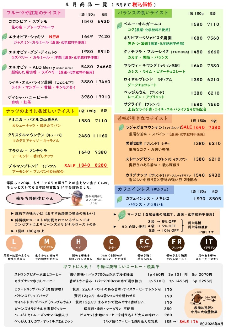 2026.03.31 ビーンズのきままなブログ, 瓦版 コメント: 0 【瓦版VOL.234】春のウン気とバスケで始まる4月の物語 清水妹コーヒー豆屋が毎月つくる、ちょっと読みたくなる新聞—— その名も『ビーンズ瓦版』。春めいてきましたね、張り切ってまいりましょう! 宮下サクライチは北海道の桜が散るまで販売します! Post Share Hatena Pocket RSS feedly Pin it 【瓦版VOL.233】19年目の瓦版 関連記事 【クリスマス2018ドリップバッグ登場~】 【瓦版VOL.190.5 号外!号外!ごうが~い!】清水姉妹、エチオピアに産地訪問行く... 【瓦版VOL.202 2023年8月】宮下、焙煎と漁師見習いと私。愛するあなたのため~毎... 【夏はアイスで】 【カフェインレスのドリップバッグが出来ました!】 【2018】 ゴールデンウィーク連休のご案内 コメント コメント ( 0 ) トラックバックは利用できません。 この記事へのコメントはありません。 返信をキャンセルする。 名前 ( 必須 ) E-MAIL ( 必須 ) ※ 公開されません URL Δ